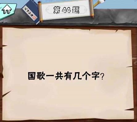 “国歌一共有几个字?”是脑筋急转弯达人LV1第44关问题,很多玩家还不知道答案是什么,接下来小编为你带来脑筋急转弯达人LV1第44关答案。 问题:国歌一共有几个字? 答案:两个。 老友网www.andlaou.com免费为你分享