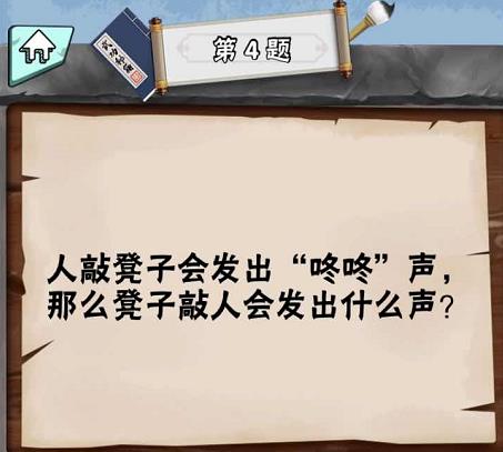 “人敲凳子会发出咚咚声,那么凳子敲人会发出什么声?”是脑筋急转弯达人LV1第4关问题,很多玩家还不知道答案是什么,接下来小编为你带来脑筋急转弯达人LV1第4关答案。