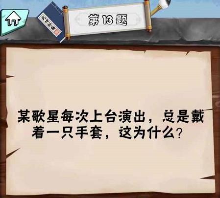 “某歌星每次上台演出总是戴着一只手套这是为什么?”是脑筋急转弯达人LV1第13关问题,很多玩家还不知道答案是什么,接下来小编为你带来脑筋急转弯达人LV1第13关答案。