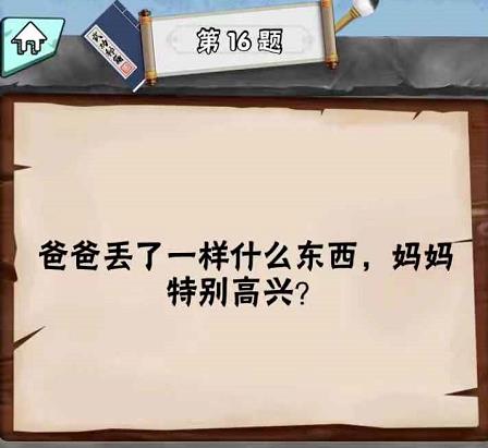 “爸爸丢了一样什么东西妈妈特别高兴?”是脑筋急转弯达人LV1第16关问题,很多玩家还不知道答案是什么,接下来小编为你带来脑筋急转弯达人LV1第16关答案。