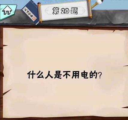 “什么人是不用电的?”是脑筋急转弯达人LV1第20关问题,很多玩家还不知道答案是什么,接下来小编为你带来脑筋急转弯达人LV1第20关答案。 问题:什么人是不用电的? 答案:缅甸人。 老友网www.andlaou.com免费为你分享