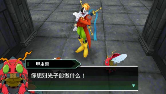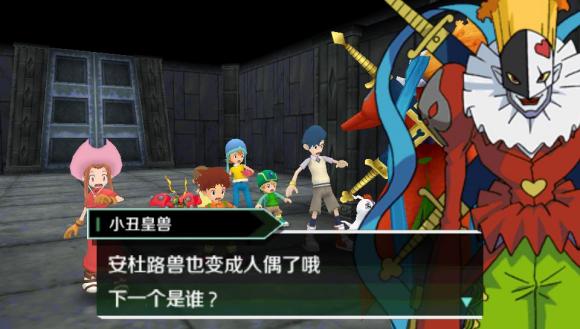 关于这一次战斗的小丑皇,没有拿出真正实力。这次小丑皇的HP较其它天王要低很多,只有44444,也自带二次行动。但是小丑皇无论攻击力,防御力还是速度几乎都是四天王中最高的。小丑皇的招式有:皇牌飞刀,飞沙走石,毁灭极光。皇牌飞刀是单体攻击,伤害较高,命中率也很高。飞沙走石是全体攻击,伤害不轻,而且很容易击晕我方。毁灭极光是单体攻击,伤害很高,但是命中率不是很高。小丑皇自带气势(攻防提升1阶段),而且基本上每次战斗都会记着使用,复原了也会马上加上!气势之后的小丑皇实力不低。(如果小丑皇忘了气势了那你今天的脸是洗的有多干净!)另外,小丑皇是黑暗系数码宝贝,神圣系数码宝贝基本上才能打疼小丑皇。(战暴钢狼的输出不及天女兽)所以这战斗的主力是天女兽,战暴钢狼则打辅助,有空也可以输出。