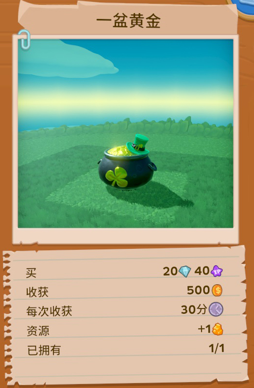 2)黄金坛(活动物品):16分钟收获1次获得1个金块,双倍的情况下是2个。但是限制每个农场只能放1个黄金坛(看过有的农场几千个,我还以为能随意放置呢,直到自己解锁才知道只能放1个)