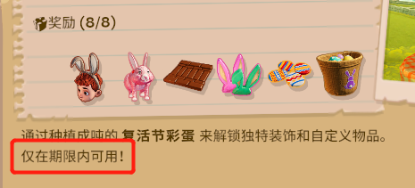 我发现很多萌新会误解这段话,【仅在期限内可用】指的是复活节彩蛋这个作物,奖励的物品是【永久存在的】,活动结束了也可以放置!而且活动进度是共享的,去别人农场收获也可以增加自己的活动进度,在他人农场按L看到的活动进度是自己的活动进度,不是对方的。