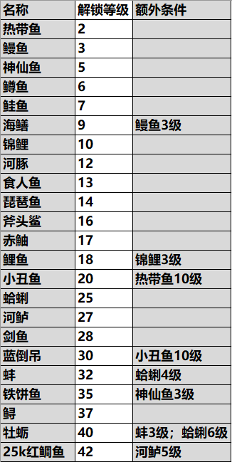 接下来是鱼类的解锁条件