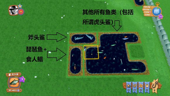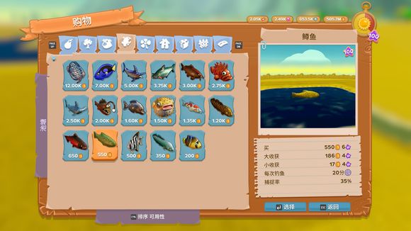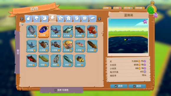 对于每次上线时间不长,每两次上线相隔较长的玩家来说,应当选择单次收获收益最大的种类,单次金币收益最高的是剑鱼,大量养殖剑鱼时,期望值是1615金币/格;单次钻石收益最高的是蓝倒吊,因为它的捕获率最高(75%)也就是0.75鱼资源/格。