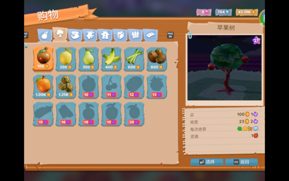 看这张图,苹果树种植。每次种植获得1经验,收获获得2经验。大多数作物都能在种植和收获时得到经验,少数例外。收获苹果时可以得到三种资源:金币、经验以及水果。这个水果数量就能在Esc呼出的菜单中看到,然后建造功能建筑用建筑通过交换获得经验和钻石(这个没多大作用就是了)。