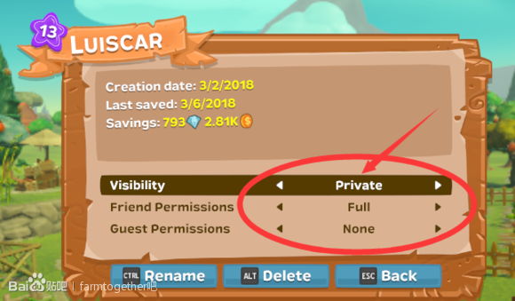 ** Permissions(权限),可以设置 Friend(好友)以及 Guest(公共访客)在你农场里可以干什么。