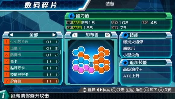 加布兽:大回复+ +ATK上升+死守+祈愿+击晕卡+防御卡+ATK芯片II+ATK芯片III+DEF芯片II。
