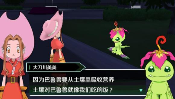 这个时候,美美和巴鲁兽正在外面玩耍。巴鲁兽用手上的藤蔓吸取土壤中的养分。(第一次见!)