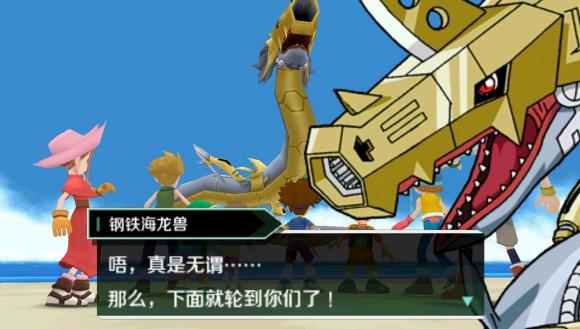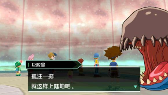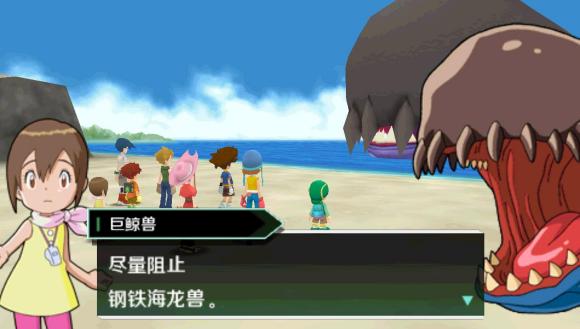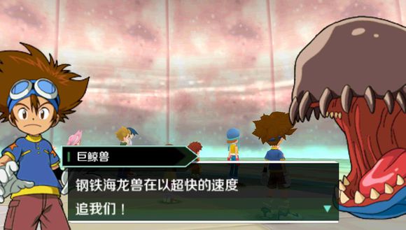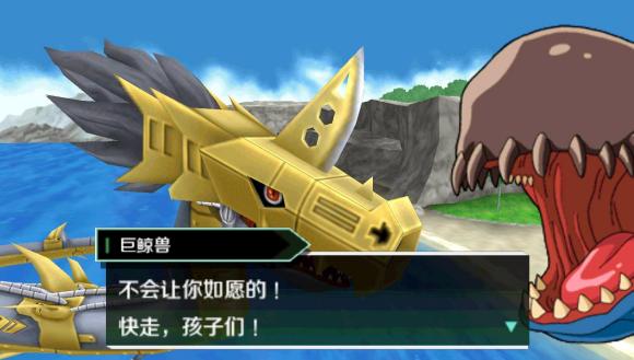 巨鲸兽想要掩护孩子们,遍要与钢铁海龙兽战斗。