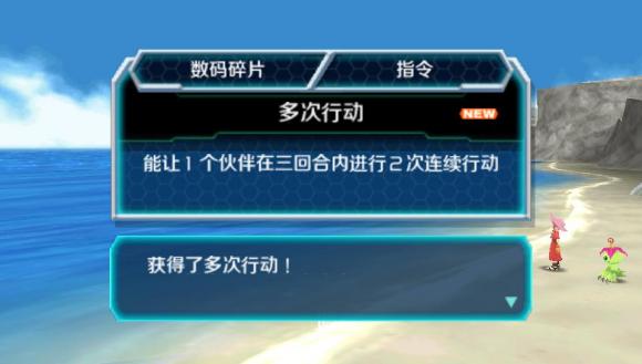 这个芯片在给某个数码宝贝装备之后,会多出一个“二次行动”的技能。它可以给我方任何一个数码宝贝施加,施加之后在其后的三回合之内可以连续行动二次,三回合之后恢复成一次,消耗20点SP。如果用得好,可以让一个数码宝贝当奶妈奶二次行动,一开始不久就可以全部人员不断二次行动!缺点是使用二次行动技能之后,进度条会后退很多很多!