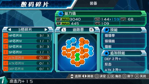 迪路兽装备:ATK上升++DEF上升++反击+2个ATK芯片III+ATK芯片II+DEF芯片II+DEF芯片IV+SPD芯片II+SPD芯片III。