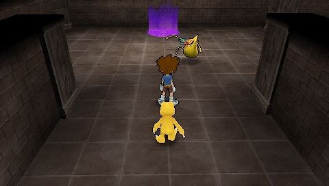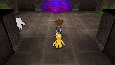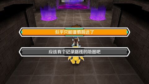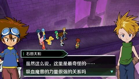 走到这里之后,太一和光子郎的对话选择第一项。另外,这些紫色东西其实是传送点,可以把我们传送到城堡的某个地方,这也是很多人在吸血魔兽城堡迷路的原因。先走右边的传送点。