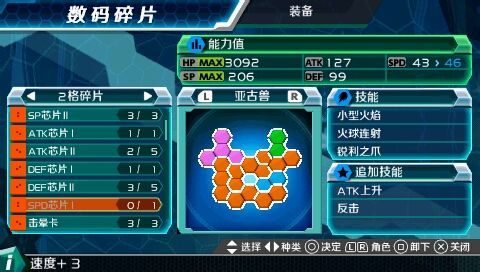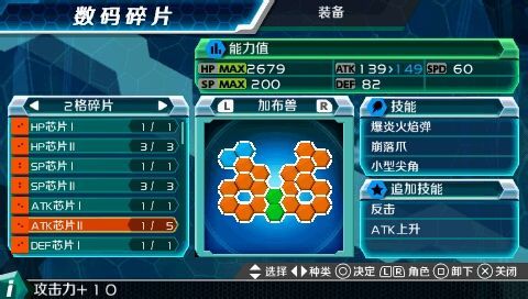 加布兽装备芯片:两个ATK芯片III+DEF芯片III+SPD芯片III+3个ATK芯片II+反击+ATK上升。