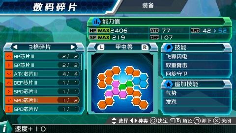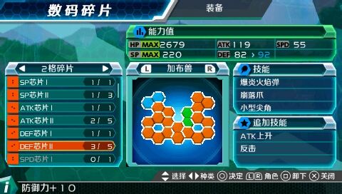 加布兽装备:SP芯片II+2个ATK芯片III+ATK上升+反击+SPD芯片II+DEF芯片III+击晕卡+ATK芯片II。