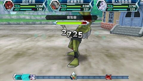 关于这场战斗,超比多兽,机械暴龙兽,兽人加鲁鲁先分别给自己提升一次攻击力,再全力输出,很容易就能取胜。这个强化的奥加兽实力并不是很强,就是HP稍微多一点罢了。(PS:为什么在餐馆外面打架?)