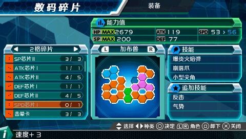 加布兽重新装备芯片:反击+气势+2个ATK芯片III+SPD芯片I+ATK芯片II+DEF芯片II+早熟。