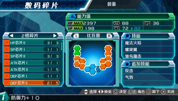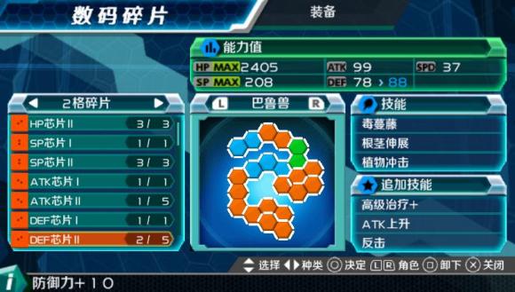 首先,等一会儿又会有一场BOSS战斗,出战方是比丘兽和巴鲁兽。比丘兽装备:反击+气势+2个ATK芯片II+2个DEF芯片II+SPD芯片I。(强迫症患者真的对不起,LZ这次无法把芯片槽填满!)