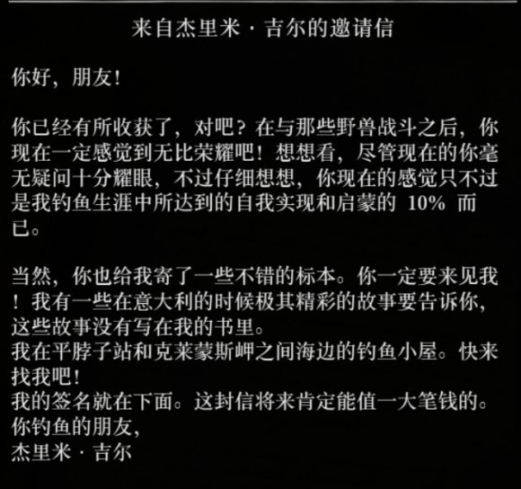 跟杰里米·吉尔见面,并邮寄他全部13条传说鱼类后,在邮局收到他的见面邀请。
