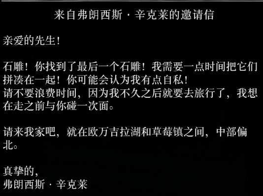 跟弗朗西斯·辛克莱见面,邮寄给他全部10处石雕坐标,在邮局收到见面邀请。