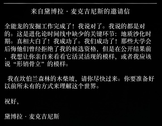 收集恐龙骨的女学者,亚瑟只能邮寄给他22处恐龙骨坐标(正常情况下),剩下8块在新奥斯汀只能由约翰邮寄。全部邮寄后在邮局收到邀请信。