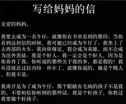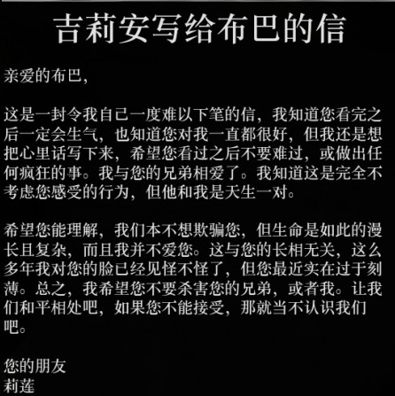一名女子诉说自己找到了灵魂伴侣的忏悔信。在世界各地的多种特定NPC身上都可以搜刮获得,这里推荐一个位置,就是上封信旁边的另一所旅馆,经常会有一个男人坐在门前的长椅上,他身上一般可以搜到这封信。