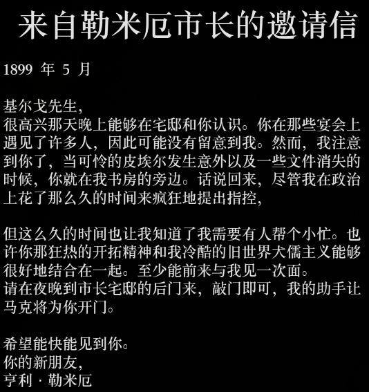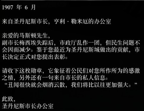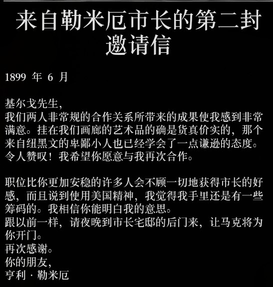 “金鸟笼”后,在邮局收到勒米厄市长的邀请信,有些脏活想要亚瑟/约翰做做。共三个阶段的任务,第一阶段完成后会收到第二封邀请信开启任务的第二部分。