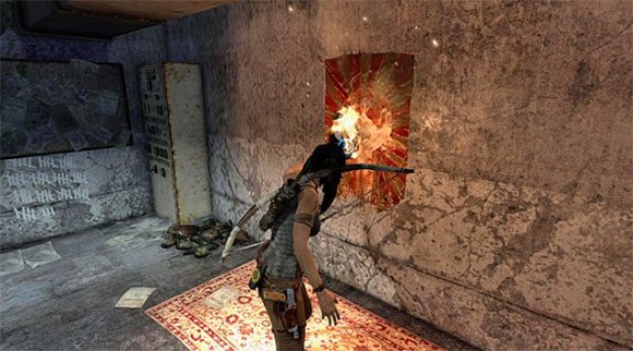 3 这面旗子在劳拉获得冲锋枪的房间里,到后面走廊里会有燃烧桶,从那里借火回来点。