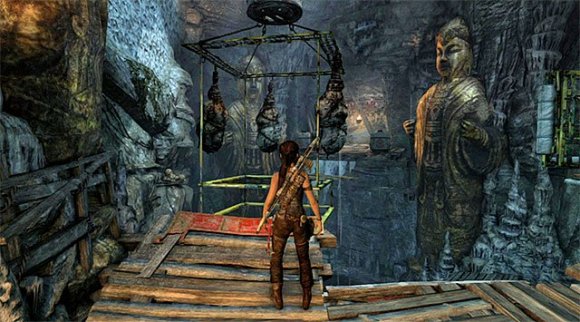到了古墓里面,借助铁架迅速跳到对面有火的平台上