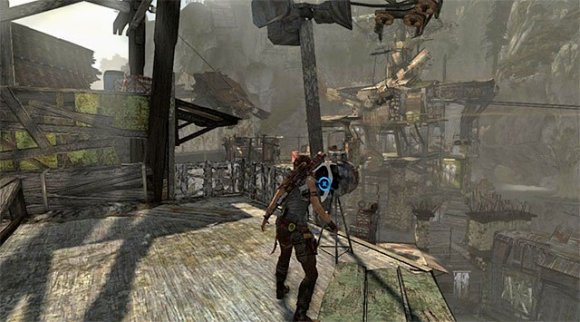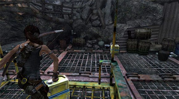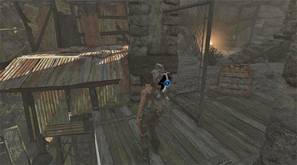到了古墓,捡起地上的重物,扔三个到吊着的铁平台上,让平台下降。