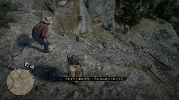 离开棚屋,向南走,一定会触发一个随机事件。一个路人在悬崖边,叫你往下看。往下看会发现有一个人的马车失控坠崖摔死了,路人会说他到镇里会向警长报告。