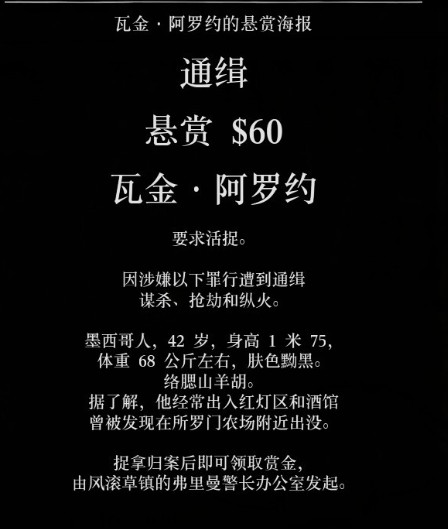 进去后墙上有悬赏海报 - 瓦金·阿罗约,领取即可开启任务。