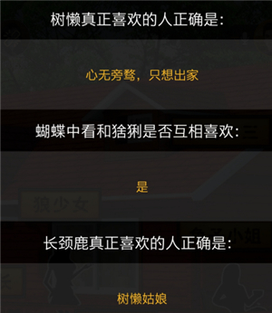 兔子小姐喜欢狼少女,狼少女喜欢长颈鹿,长颈鹿喜欢树懒姑娘,树懒姑娘只想出家。白熊店长喜欢金鱼少年,金鱼少年喜欢蝴蝶中看,蝴蝶中看和猪荆先生互相喜欢。