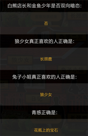 3. 青惑影响下的两人必定有—方喜欢上另—方,但是有三组同时看到青惑的人之间没有情感线,一是白熊和猪荆(摘荆赠送白熊宝石),二是蝴蝶和兔子(蝴蝶将带有青惑的帽子卖给了兔子),三是树懒没有受到影响。三对的共同点是都有石楠参与(猪荆石楠烟斗,兔子的中药,树懒身上的石楠树枝和叶子),说明石楠可抵消掉青惑的魔力,且这几人之间原本就没有感情线。