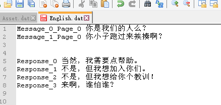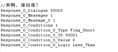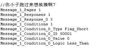 先讲下对话文件:对话文件除去GUID、类型、ID(首三行)必须还要有两部分,消息栏(Message)和回话框(Response),这是制作的主要内容。