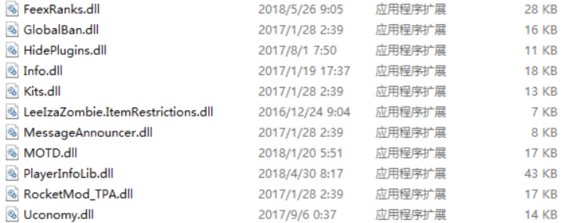 一般我们找到的插件都是dll结尾的文件,将插件放入服务端文件的Rocket/plugin里,这里列举一部分插件: