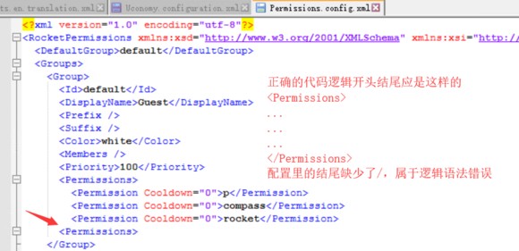 我们可以看到报错:at Rocket.Core.Permissions,这就表明我们的报错是在权限组里,但是由于他没有显示的哪行写错了,所以我们需要有良好的代码逻辑意识,错误配置如下:
