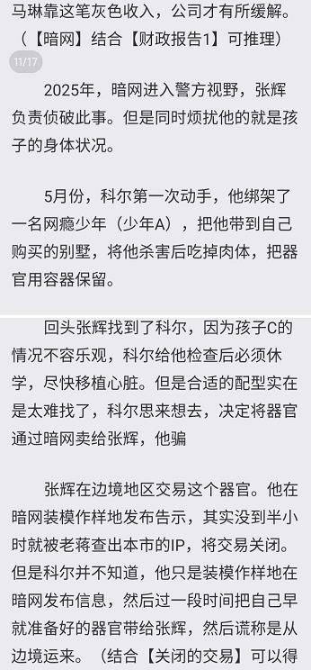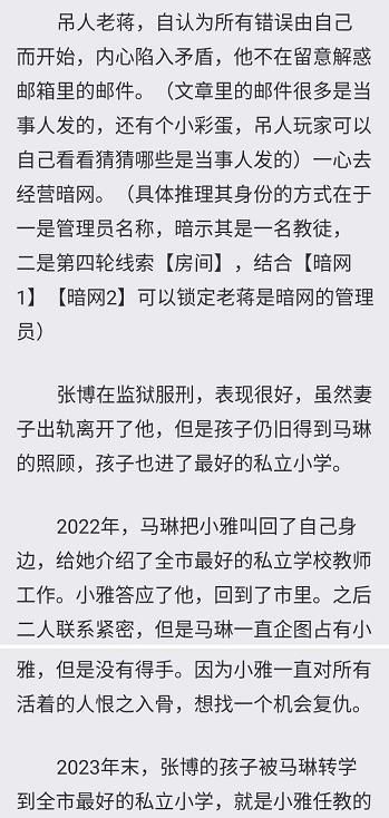 8月份,马琳扩展暗网业务,在自己 旗下的酒店安装摄像头,对女性住客偷 拍,然后威胁她们进行接客,以及色情表 演。并把所有资料转移到监狱中的张博那 里避人耳目,条件是把一大部分酬劳给张 博。(【暗网2】【大量移动硬盘】结合 可推出此线索)