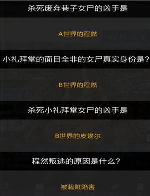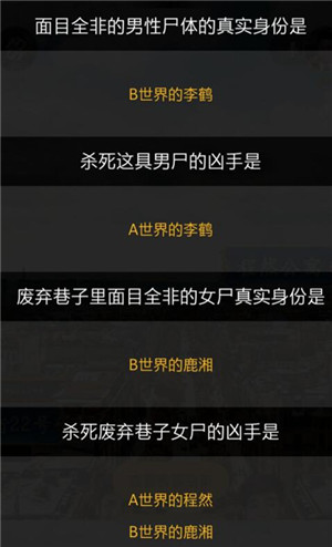 在A世界时,鹿湘B在A世界暗中查出鹿湘A被自己的男朋友刘成所杀,从此以后对男人失望,与同是来自B世界的"地狱火”计划执行人,替换原本A世界程然的程然B发生了关系,这种关系后来被刘成A发现。所以,在A世界生活的李鹤A的妻子是程然B,而警察程然则是程然A,在玩家的回忆中她曾经小时候被人绑架过,便是从A世界绑架到了B世界,所以在B世界的警察程然应该是程然A。