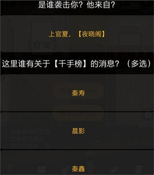 辰初一刻:大多数人都已经起床,秦寿缠着秦鑫,秦鑫生气冲上楼是撞到谢琨,谢琨手中的糕点掉下楼泼在晨影身上,晨影手中的一张画像被毁O晨影发现了秦寿是千手榜上的人,并要挟秦寿帮忙。秦寿拿着晨影给的傀儡潜入赵、谢二入房间,将傀儡放在了柜子里。
