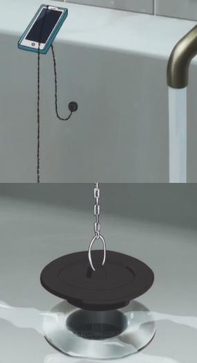 14:00萧蒙面用迷药喷雾迷倒申刀疤,拖入浴缸用强力胶带固定。将申刀疤的手机缠着闭水塞子的链子,放在浴缸边缘,然后打开浴缸水龙头,水量调至大约1个小时左右能放满浴缸。如图: