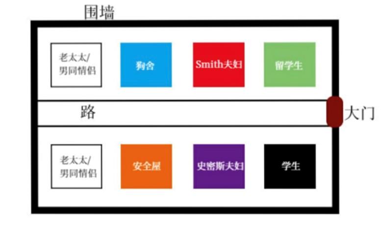 住户位置:两家人的位置都是左右两边和对面都有房子,且对面都有长住的住户,所以紫色为史密斯夫妇,红色为Smith夫妇,绿色和黑色为学生,蓝色为狗舍,橙色为安全屋,两个空白的方格为独居老太太和自由工作者。