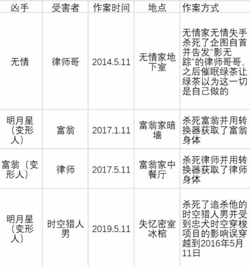 2016年5月11日:因为忠犬的时空穿梭项目,来自2019年5月11日的明月星(变形人)穿越到了2016年并失去记忆。之后明月星(变形人)阴差阳错恢复了部分记忆,杀死并取代了富翁。