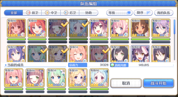 由于楼主配置大大达标,所以下了真布用初音来加速输出。其实暴击弓(铃奈)输出更高,但是星级和血量较低经常被BOSS奥义秒杀,后排5500+血量的输出都可以考虑。切勿!切勿上前排输出!