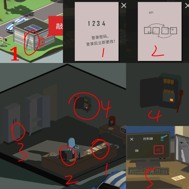 2.进门后在桌子左手边不断点击纸,露出最下面一张写着密码1234,右手电脑键盘下有个图形调整了数字的位置变为2413