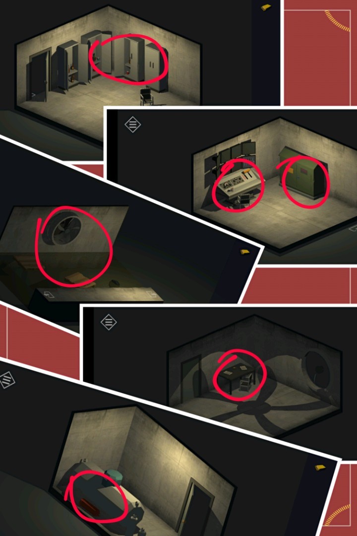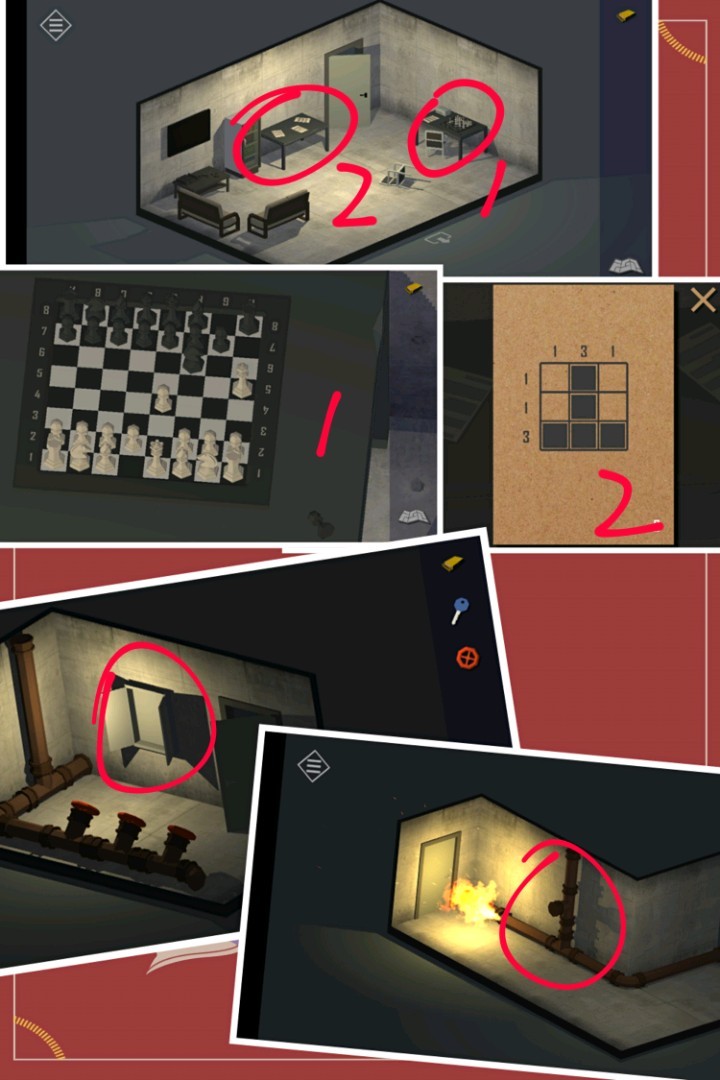 2.看着地图到休息室,就是有水渠通风扇那边,旋转一下位置调整视角到右边就是。开门在一个桌子上看到象棋和密码锁。根据旁边纸条的提示,不看开始,只看象棋落点。可以看到棋盘上走了四步,白棋吃了一子,白棋先开始,王后走斜不能越子,兵走前。所以可以推算出密码E4H5H5F6,得到蓝钥匙。在另一个桌子上看到三张纸条,根据2的提示,推出1 3的答案。用这些答案打开气体进料的门,在壁柜里拿到阀门,安到动力房间前管道上,关闭大火。