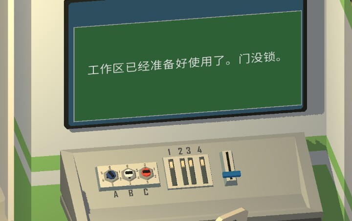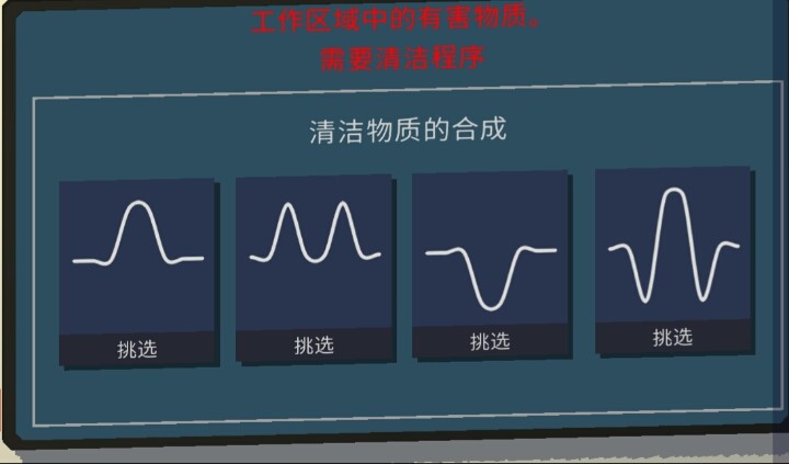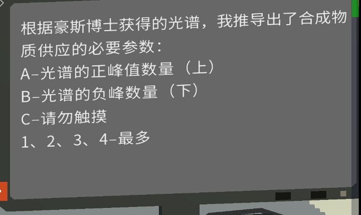 6.结合两台电脑上信息,得ABC=430,1234通通打到最上面,如图所示挑选物质光谱。点击蓝色开关,合成清洁物质,工作区(那个头顶闪红灯的)开放,进去拿到3级门禁卡