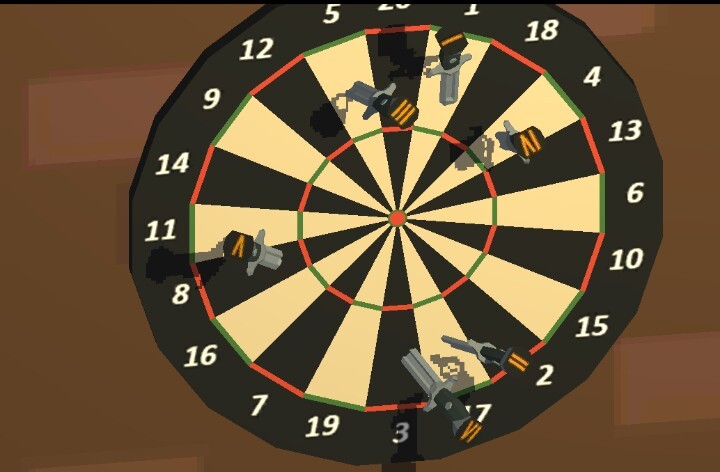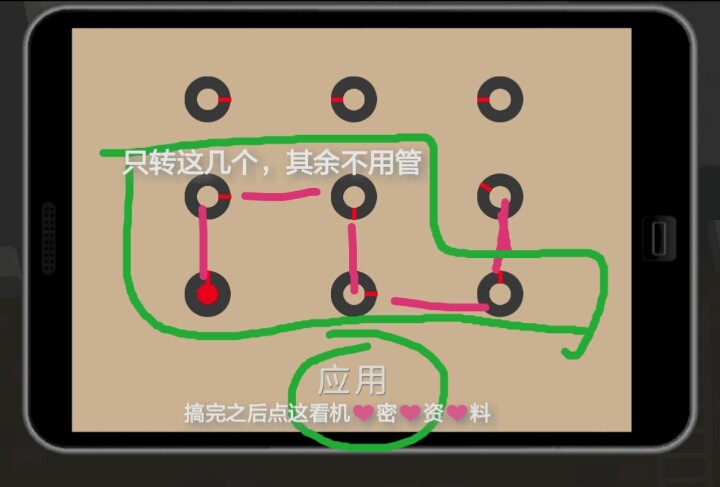 6.进入左边的房子,桌上有集装箱钥匙。观察墙上的靶,按飞镖标记的罗马数字(I~VI)排列其所在分数区,判断出保险箱密码为1 17 5 4 8 3,奇数位密码顺时针转,偶数,位逆时针转,打开保险箱,得到平板。