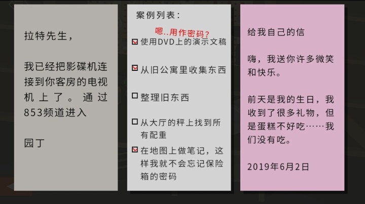 8.用螺丝刀撬开书房卡住的抽屉,得到光盘,插入DVD播放机,进入853频道,结合幻灯片15与书房地图,得到保险柜密码。
